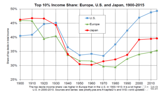 在最新出版的《資本與意識形態(tài)》一書中,法國著名經(jīng)濟學(xué)家托馬斯·皮凱蒂描繪了前10%的高收入占比變動情況。