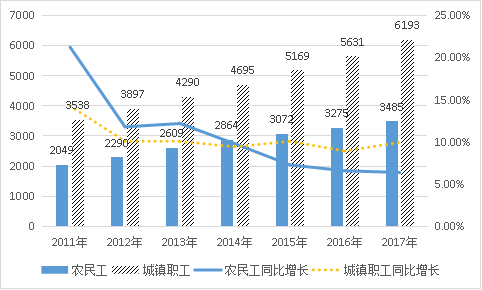 數(shù)據(jù)來源:根據(jù)《2011—2017年度人力資源和社會保障事業(yè)發(fā)展統(tǒng)計公報》《2011—2017國家統(tǒng)計局農(nóng)民工監(jiān)測調(diào)查報告》整理