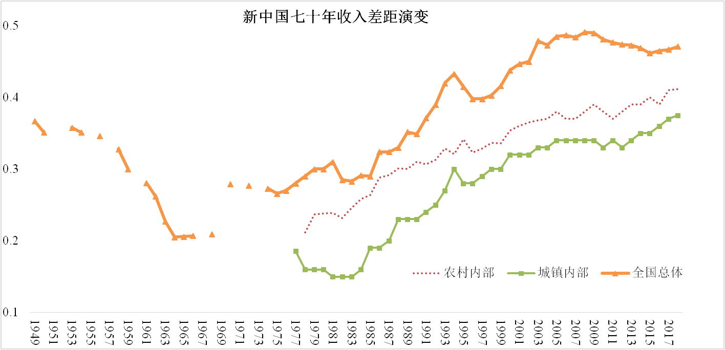 資料來源:全國基尼系數(shù)來自于世界銀行(1981-2001),收入分配課題組(2002)和國家統(tǒng)計局(2003-2017)的估計結(jié)果。農(nóng)村和城鎮(zhèn)的基尼系數(shù)來自于歷年的“中國居民收入分配年度報告”。2012-2017年農(nóng)村及2011-2017年城鎮(zhèn)內(nèi)部數(shù)據(jù)來自于省份加權(quán)計算結(jié)果。1978-1980年全國基尼系數(shù)來自于省份加權(quán)并調(diào)整的結(jié)果。1949-1977年全國總體、城鎮(zhèn)內(nèi)部、農(nóng)村內(nèi)部差距,都來自于UNU-WIDER數(shù)據(jù)庫。