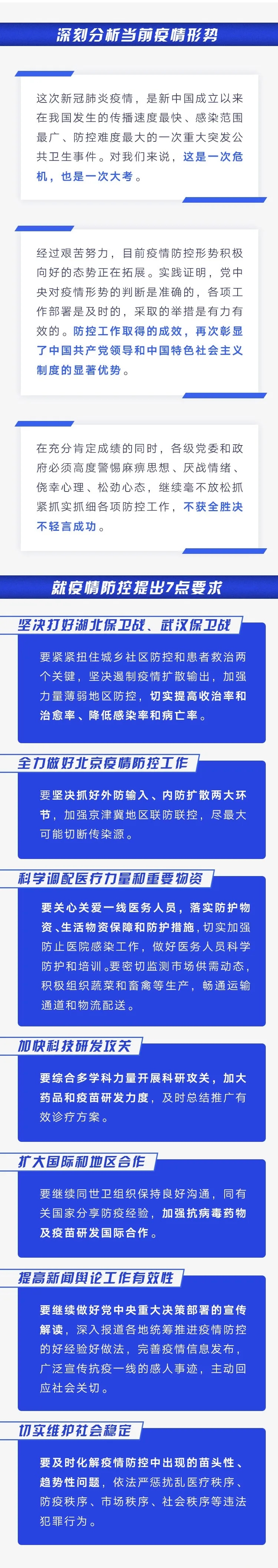 習(xí)近平強調(diào),在充分肯定成績的同時,各級黨委和政府必須高度警惕麻痹思想、厭戰(zhàn)情緒、僥幸心理、松勁心態(tài),繼續(xù)毫不放松抓緊抓實抓細(xì)各項防控工作,不獲全勝決不輕言成功。習(xí)近平提出7點要求。第一,堅決打好湖北保衛(wèi)戰(zhàn)、武漢保衛(wèi)戰(zhàn)。要緊緊扭住城鄉(xiāng)社區(qū)防控和患者救治兩個關(guān)鍵,堅決遏制疫情擴散輸出,加強力量薄弱地區(qū)防控,切實提高收治率和治愈率、降低感染率和病亡率。第二,全力做好北京疫情防控工作。要堅決抓好外防輸入、內(nèi)防擴散兩大環(huán)節(jié),加強京津冀地區(qū)聯(lián)防聯(lián)控,盡最大可能切斷傳染源。第三,科學(xué)調(diào)配醫(yī)療力量和重要物資。要關(guān)心關(guān)愛一線醫(yī)務(wù)人員,落實防護物資、生活物資保障和防護措施,切實加強防止醫(yī)院感染工作,做好醫(yī)務(wù)人員科學(xué)防護和培訓(xùn)。要密切監(jiān)測市場供需動態(tài),積極組織蔬菜和畜禽等生產(chǎn),暢通運輸通道和物流配送。第四,加快科技研發(fā)攻關(guān)。要綜合多學(xué)科力量開展科研攻關(guān),加大藥品和疫苗研發(fā)力度,及時總結(jié)推廣有效診療方案。第五,擴大國際和地區(qū)合作。要繼續(xù)同世衛(wèi)組織保持良好溝通,同有關(guān)國家分享防疫經(jīng)驗,加強抗病毒藥物及疫苗研發(fā)國際合作。第六,提高新聞輿論工作有效性。要繼續(xù)做好黨中央重大決策部署的宣傳解讀,深入報道各地統(tǒng)籌推進(jìn)疫情防控的好經(jīng)驗好做法,完善疫情信息發(fā)布,廣泛宣傳抗疫一線的感人事跡,主動回應(yīng)社會關(guān)切。第七,切實維護社會穩(wěn)定。要及時化解疫情防控中出現(xiàn)的苗頭性、趨勢性問題,依法嚴(yán)懲擾亂醫(yī)療秩序、防疫秩序、市場秩序、社會秩序等違法犯罪行為。