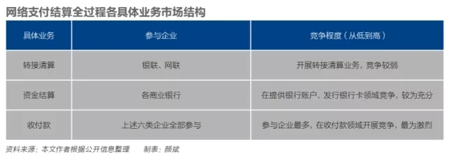把支付結算作為一個完整業(yè)務來看,各個環(huán)節(jié)、各企業(yè)交織在一起,競爭力量有較大差距。