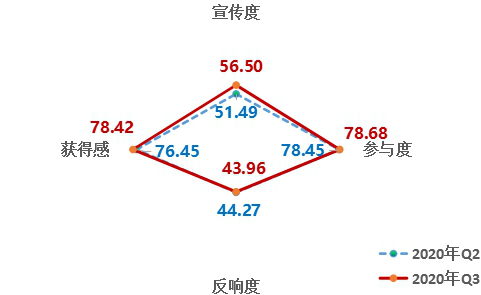 4、從維度來(lái)看,反響度小幅下降,宣傳度明顯提升。第三季度,宣傳度得分56.50,參與度得分78.68,反響度得分43.96,獲得感得分78.42。與上一季度相比,除反響度外,其他維度均有上升;其中宣傳度升幅較大。