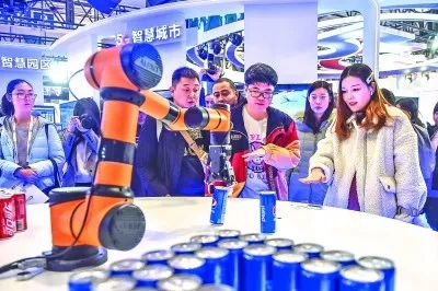 參觀者在北京一場5G大會上控制機(jī)械臂抓取飲料,體驗(yàn)“隔空取物”