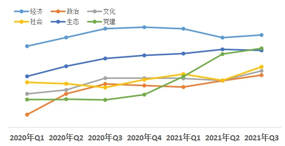 從近幾個季度的評估結果來看,經濟領域熱度值領先其他領域;黨建領域熱度值從2020年第三季度開始穩(wěn)步上升,且增幅高于文化、社會等領域;政治領域改革熱度值從今年一季度以來持續(xù)呈上升趨勢。