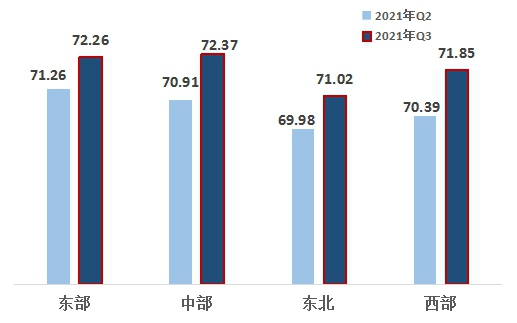 2、從區(qū)域來看,西部、中部地區(qū)熱度指數增長明顯。東、中、東北、西部改革熱度指數分別為72.26、72.37、71.02、71.85。中部地區(qū)超越東部地區(qū)位列第一,西部地區(qū)超越東北地區(qū)位居第三,東北地區(qū)最后。四大區(qū)域均比上一季度有所上升。其中,西部、中部地區(qū)的增幅較大。