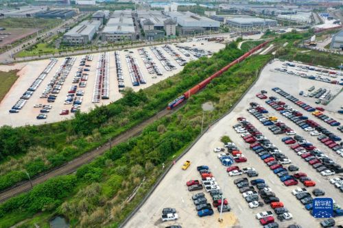 4月14日,長城汽車專列首發(fā)列車行駛在重慶永川國家高新區(qū)鐵路專用線上(無人機照片)。新華社記者 唐奕 攝