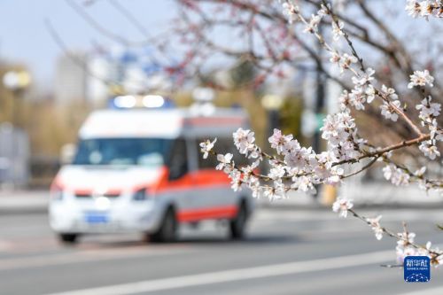 4月14日,一輛救護車在吉林市松江東路上駛過,路邊桃花已經(jīng)盛開。新華社記者 張楠 攝