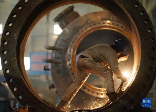 4月14日,在哈電集團哈爾濱鍋爐廠有限責(zé)任公司車間,工人進行生產(chǎn)作業(yè)。新華社記者 王建威 攝