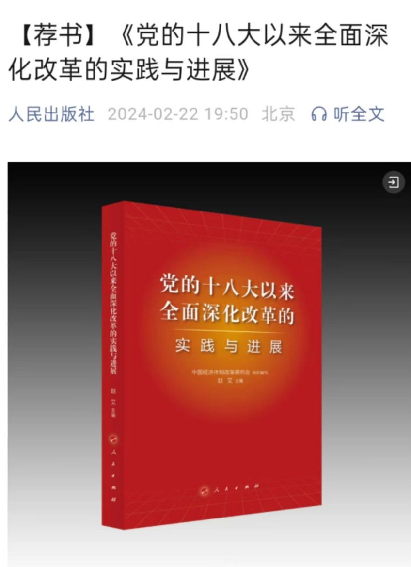 2024年2月22日,由我會組織編寫,會長彭森作序、常務(wù)副會長兼秘書長趙艾主編的《黨的十八大以來全面深化改革的實踐與進展》一書,入選人民出版社官方微信公眾號[薦書]欄目,成為人民出版社推薦的新書。