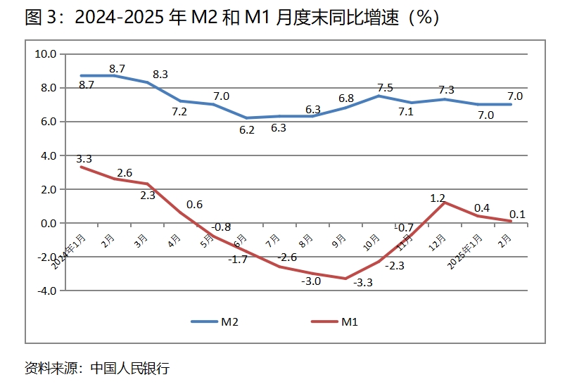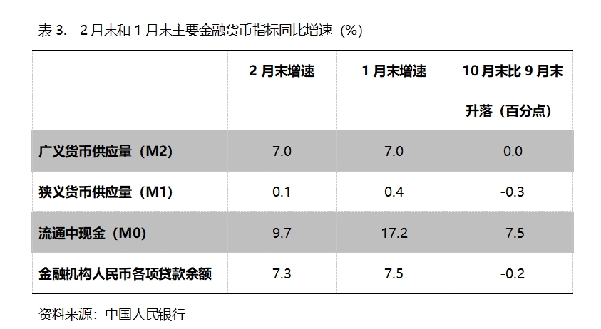 (三)M2增速由落轉(zhuǎn)平。2月末,廣義貨幣供應(yīng)量(M2)同比增長7.0%,與1月末增長7.0%持平,1月末增速比上年12月末增速回落了0.3個百分點;狹義貨幣供應(yīng)量(M1)增速持續(xù)回落,2月末同比增長0.1%,比1月末增長0.4%回落0.3個百分點,而1月末增幅比上年12月末增幅回落0.8個百分點;流通中貨幣(M0)增速由升轉(zhuǎn)落,2月末同比增長9.7%,比1月末增長17.2%回落了7.5個百分點,而1月末增速比上年12月末增速回升了4.2個百分點。按照貨幣政策適度寬松的要求,貨幣供應(yīng)量增速存在著提速的必要。