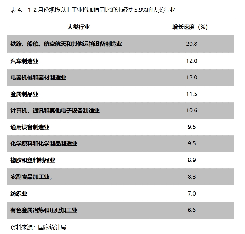 1-2月份,增長速度超過規(guī)模以上工業(yè)增長5.9%的主要大類行業(yè)共有11個,即鐵路、船舶、航空航天和其他運輸設(shè)備制造業(yè)增長20.8%,汽車制造業(yè)增長12.0%,電器機(jī)械和器材制造業(yè)增長12.0%,金屬制品業(yè)增長11.5%,計算機(jī)、通訊和其他電子設(shè)備制造業(yè)增長10.6%,通用設(shè)備制造業(yè)增長9.5%,化學(xué)原料和化學(xué)制品制造業(yè)增長9.5%,橡膠和塑料制品業(yè)增長8.9%,農(nóng)副食品加工業(yè)增長8.3%,紡織業(yè)增長7.0%,有色金屬冶煉和壓延加工業(yè)增長6.6%。