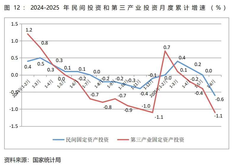 (二)民間投資和第三產(chǎn)業(yè)投資增速均由增長轉(zhuǎn)為下降,餐飲收入增速回落較多。上半年民間固定資產(chǎn)投資同比下降0.6%,一季度為增長0.4%,這是自2023年9月以來月度累計的最大降幅;第三產(chǎn)業(yè)固定資產(chǎn)投資同比下降1.1%,一季度為增長0.1%,這是今年以來月度累計的最大降幅;餐飲收入同比增長4.3%,比一季度增長4.7%回落了0.4個百分點,比上年同期增長7.9%回落3.6個百分點。這些指標(biāo)增速的變化需引起宏觀調(diào)控政策的高度關(guān)注。