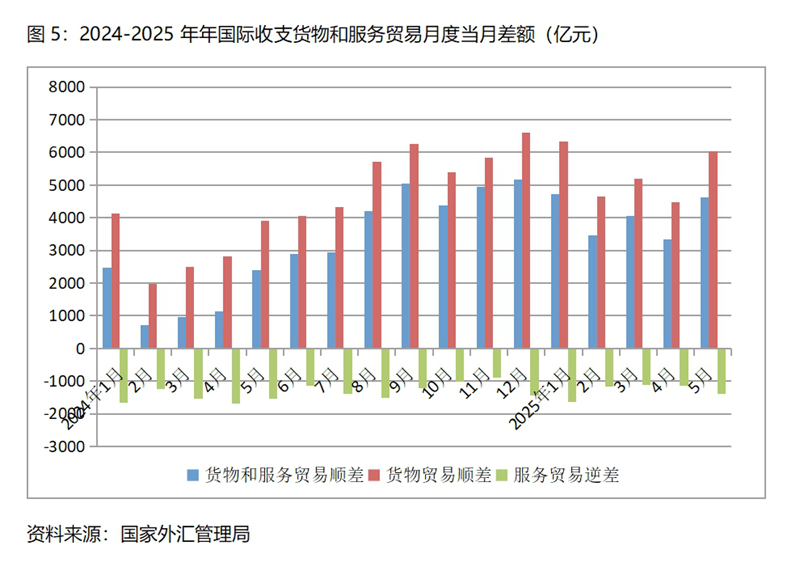 (四)國際收支貨物和服務(wù)貿(mào)易順差持續(xù)增加。今年1月份國際收支貨物和服務(wù)貿(mào)易順差比上年同月增加2252億元;2月份順差增加2735億元,3月順差增加3093億元,4月順差增加2199億元,5月順差增加2249億元,國際收支貨物和服務(wù)貿(mào)易順差比上年同期有著明顯的增加。在美國“對等關(guān)稅”政策的沖擊下,國際收支貨物和服務(wù)貿(mào)易仍實現(xiàn)較大的順差,足以說明我國經(jīng)濟有著較強的國際競爭力。