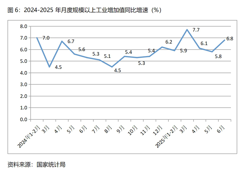 (一)工業(yè)生產(chǎn)增速比一季度略有回落,比上年同期回升。 上半年規(guī)模以上工業(yè)增加值同比增長6.4%,比一季度增長6.5%回落了0.1個百分點,比上年同期增長6.0%回升0.4個百分點。其中,采礦業(yè)同比增長6.0%,比一季度增長6.2%回落了0.2個百分點;制造業(yè)增長7.0%,比一季度增長7.1%回落了0.1個百分點;電力、熱力、燃?xì)饧八a(chǎn)和供應(yīng)業(yè)增長1.9%,與一季度持平。