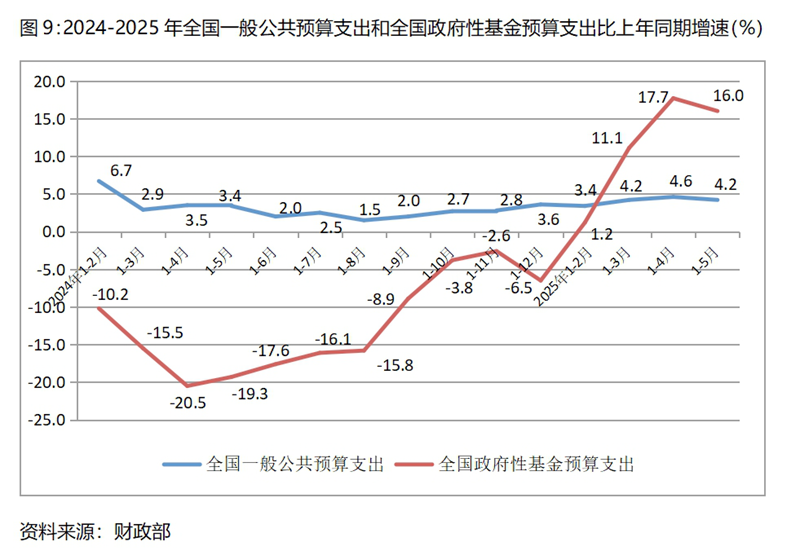 (四)一般公共預(yù)算支出增速與一季度持平、比上年同期回升,政府性基金預(yù)算支出增速比一季度回升、由上年同期下降轉(zhuǎn)為增長。1-5月份全國一般公共預(yù)算支出同比增長4.2%,與一季度增長4.2%持平,比上年同期增長3.4%回升了0.8個百分點,但增速仍有一些偏慢;全國政府性基金預(yù)算支出同比增長16.0%,比一季度增長11.1%回升4.9個百分點,上年同期為下降19.3%,呈現(xiàn)出明顯回升的態(tài)勢。從拉動經(jīng)濟增長的要求看,特別是在面對微觀經(jīng)營主體需求不足的形勢下,政府支出還需要更快一些,有必要進一步加大政府支出的力度。