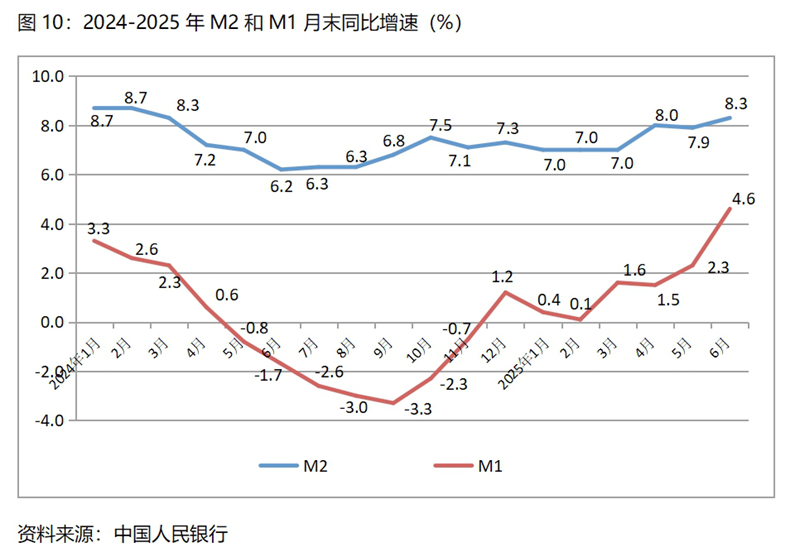 (五)廣義貨幣供應(yīng)量(M2)增速比一季度末和上年同期均保持回升,狹義貨幣供應(yīng)量(M1)增速比一季度末和上年同期也均保持回升。6月末,廣義貨幣供應(yīng)量同比增長8.3%,比一季度末增長7.0%回升了1.3個百分點,比上年同期增長6.2%回升了2.1個百分點,總體保持了今年以來持續(xù)回升的勢頭;6月末,狹義貨幣供應(yīng)量同比增長4.6%,比一季度末增長1.6%回升了3.0個百分點,而上年同期為下降1.7%。說明今年以來的貨幣政策較好地堅持了適度寬松的方向,為經(jīng)濟運行提供了較為寬松的流動性,但從微觀經(jīng)營主體活力不足和價格低位運行看,貨幣政策還有進一步寬松的必要。