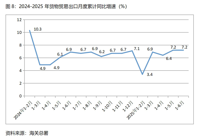 下半年GDP保持4.8%以上的增速,有政策實施、有趨勢慣性以及上年穩(wěn)定基數(shù)等因素的支撐。上半年積極的財政政策通過擴大支出、適度寬松貨幣政策通過降準(zhǔn)降息、擴大內(nèi)需通過設(shè)備更新和以舊換新等政策措施,在下半年將會繼續(xù)發(fā)揮作用,加之下半年積極財政政策和適度寬松貨幣政策的繼續(xù)實施,“兩重”、“兩新”政策等一系列政策措施的落實,對下半年經(jīng)濟增長形成了有力支持。上半年GDP的較快增長,對下半年GDP增長發(fā)揮著慣性的作用,加之下半年GDP增長基數(shù)與上半年基數(shù)均是5.0%,穩(wěn)定的基數(shù)有利于下半年GDP增長4.8%以上。