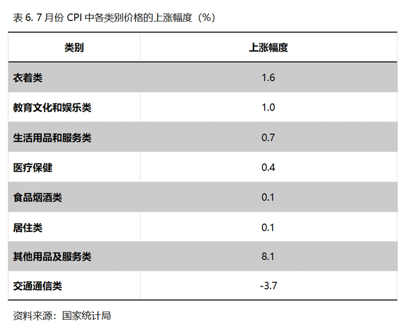 7月份,在CPI 8個類別中有7個類別保持上漲,1個類別下降。上漲的7個類別包括衣著類價格同比上漲1.6%,教育文化和娛樂類上漲1.0%,生活用品及服務類上漲0.7%,醫(yī)療保健類上漲0.4%,食品煙酒類上漲0.1%,居住類上漲0.1%,其他用品和服務類上漲8.1%;下降的雖然就交通通信類1個類別,但降幅仍還比較大,7月份同比下降3.7%。
