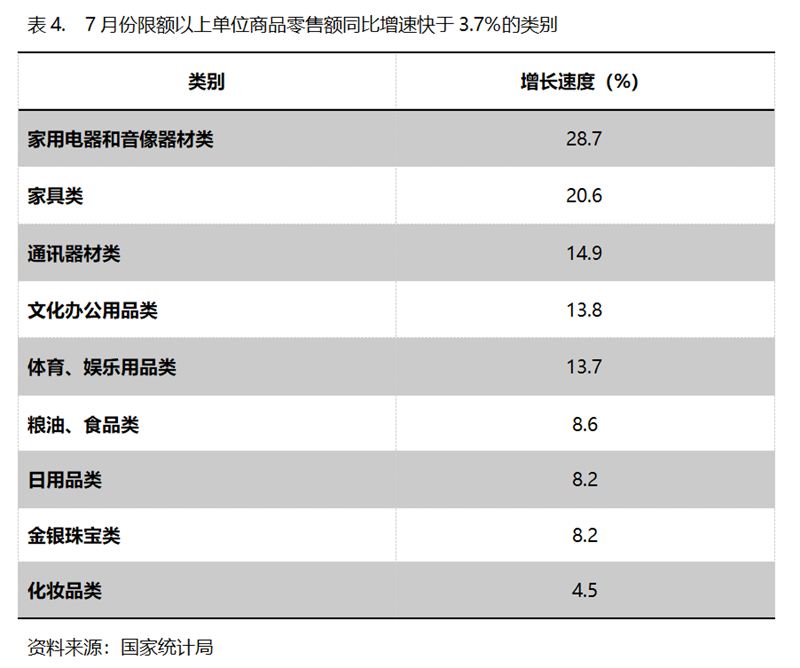 7月份,限額以上單位商品零售額同比增速快于社會消費品零售總額3.7%增速的共有9類,即家用電器和音像器材類同比增長28.7%,家具類增長20.6%,通訊器材類增長14.9%,文化辦公用品類增長13.8%,體育、娛樂用品類增長13.7%,糧油、食品類增長8.6%,日用品類增長8.2%,金銀珠寶類增長8.2%,化妝品類增長4.5%。