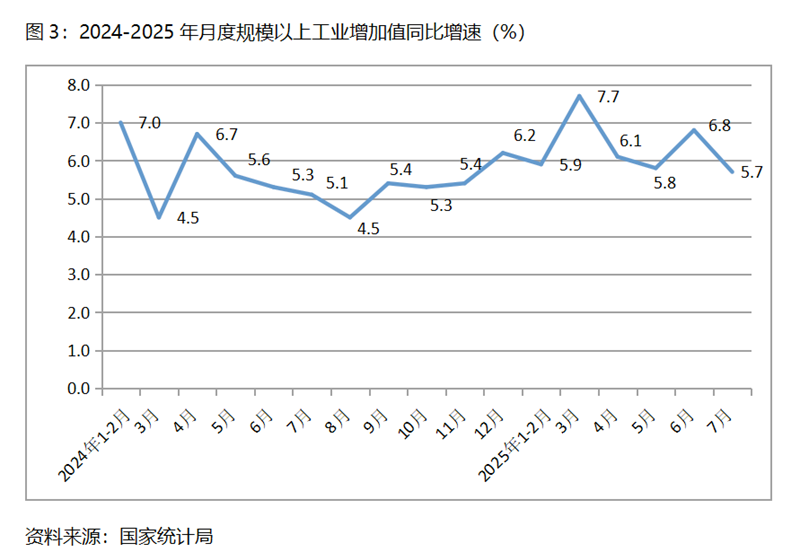 (一)工業(yè)增速由升轉落。7月份,規(guī)模以上工業(yè)增加值同比增長5.7%,比上月增長6.8%回落了1.1個百分點,6月份比5月份回升了1.0個百分點。從工業(yè)三大門類看,采礦業(yè)和制造業(yè)增速比上月回落,電力、熱力、燃氣及水生產(chǎn)和供應業(yè)增速回升,7月份采礦業(yè)同比增長5.0%,比上月回落1.1個百分點;制造業(yè)增長6.2%,比上月回落1.2個百分點;電力、熱力、燃氣及水生產(chǎn)和供應業(yè)增長3.3%,比上月回升1.5個百分點。今年以來工業(yè)增速波動的運行,反映出工業(yè)的回升仍缺乏穩(wěn)固的基礎。