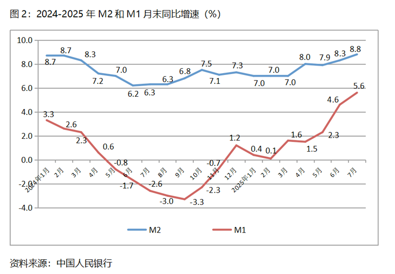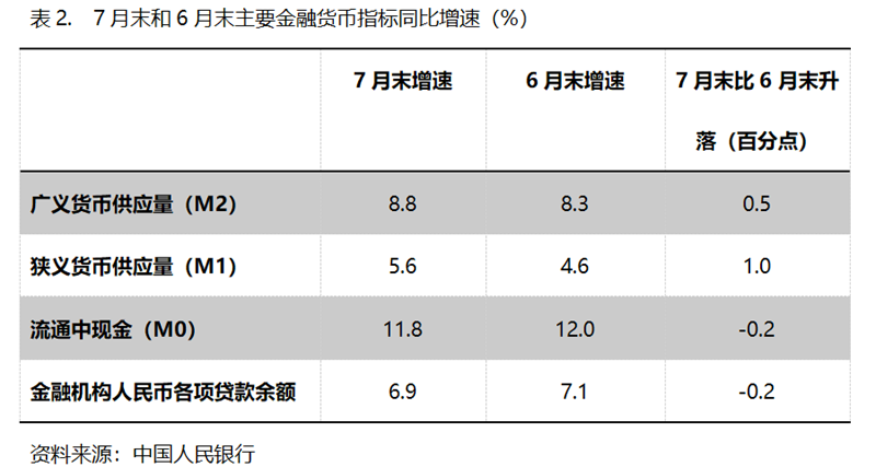 (二)M2增速持續(xù)回升。7月末,廣義貨幣供應量(M2)同比增長8.8%,比6月末增長8.3%回升0.5個百分點,6月末增速比5月末7.9%的增速回升了0.4個百分點,保持了持續(xù)回升勢頭;狹義貨幣供應量(M1)同比增長5.6%,比6月末增長4.6%回升1.0個百分點,6月末增幅比5月末2.3%增幅回升2.3個百分點;流通中貨幣(M0)增速持續(xù)小幅回落,7月末同比增長11.8%,比6月末增長12.0%回落0.2個百分點,而6月末增速比5月末增速回落0.1個百分點。7月末M2和M1增速的持續(xù)回升,M0增速的基本持平,表明貨幣政策仍在向適度寬松方向的要求運行, M1緩慢的增長仍需要給予高度關注。