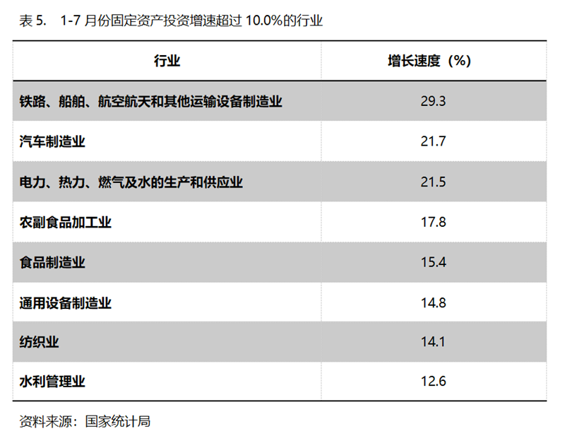 1-7月份,固定資產(chǎn)投資增速超過10.0%的主要行業(yè)共8個,即鐵路、船舶、航空航天和其他運輸設備制造業(yè)增長29.3%,汽車制造業(yè)增長21.7%,電力、熱力、燃氣及水的生產(chǎn)和供應業(yè)增長21.5%,農(nóng)副食品加工業(yè)增長17.8%,食品制造業(yè)增長15.4%,通用設備制造業(yè)增長14.8%,紡織業(yè)增長14.1%,水利管理業(yè)增長12.6%。