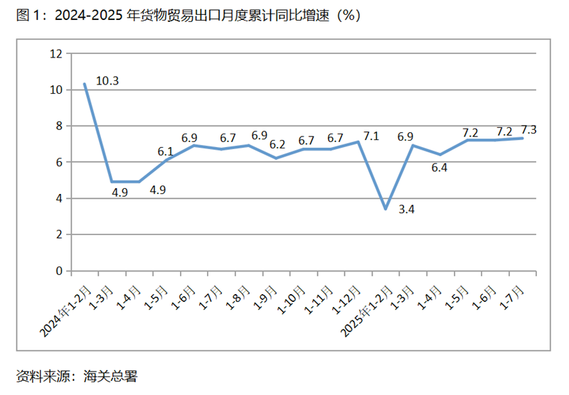 (一)貨物出口增速由平轉升。1-7月份,貨物出口同比增長7.3%,比1-6月份增長7.2%回升0.1個百分點,1-6月份與1-5月份持平,增速呈現(xiàn)出由平轉升的態(tài)勢。貨物出口對主要貿易出口經(jīng)濟體增速有升有平也有落,1-7月份對歐盟出口同比增長8.2%,比1-6月份7.9%增速回升0.3個百分點;對美國出口下降11.6%,比1-6月份下降9.9%擴大1.7個百分點;對東盟出口增長14.8%,比1-6月份14.3%增速回升0.5個百分點;對拉丁美洲出口增長8.4%,與1-6月份8.4%增速持平;對非洲出口增長25.9%,比1-6月份23.0%增速回升2.9個百分點。面對較為復雜嚴峻的國際形勢,出口增速由平轉升,充分說明我國出口有著較強的韌性。