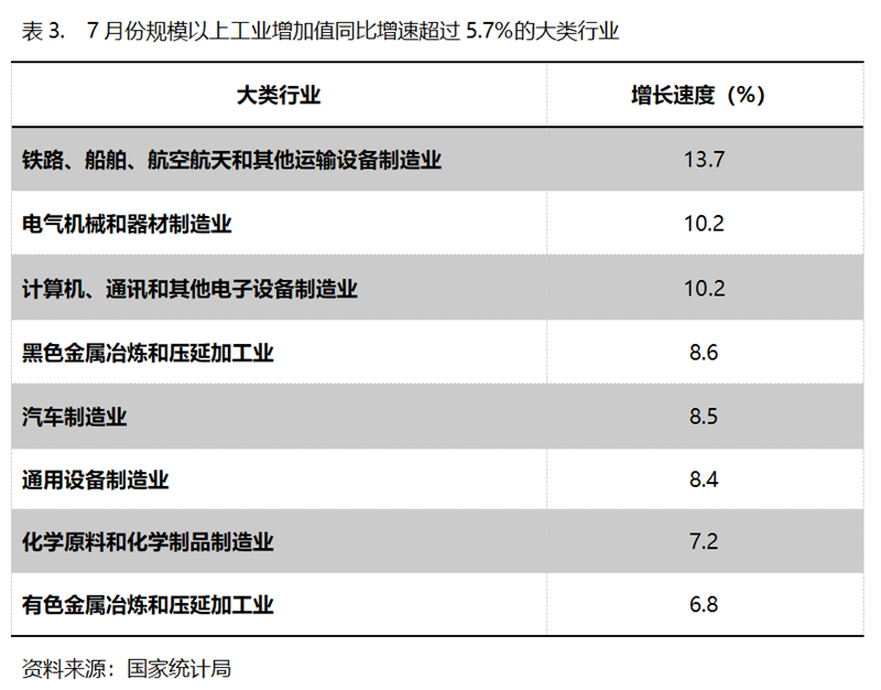 7月份,增長速度超過規(guī)模以上工業(yè)增長5.7%的主要大類行業(yè)共有8個,即鐵路、船舶、航空航天和其他運輸設備制造業(yè)同比增長13.7%,電氣機械和器材制造業(yè)增長10.2%,計算機、通訊和其他電子設備制造業(yè)增長10.2%,黑色金屬冶煉和壓延加工業(yè)增長8.6%,汽車制造業(yè)增長8.5%,通用設備制造業(yè)增長8.4%,化學原料和化學制品制造業(yè)增長7.2%,有色金屬冶煉和壓延加工業(yè)增長6.8%。
