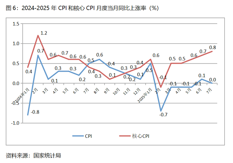 (四) CPI漲幅比上月回落。7月份,CPI同比漲幅持平,比6月份上漲0.1%回落0.1個百分點, 自3月份以來一直保持在-0.1-0.1%區(qū)間,持續(xù)呈現(xiàn)低位運行態(tài)勢。7月份,核心CPI同比上漲0.8%,比6月份上漲0.7%上升了0.1個百分點。雖然核心CPI漲幅保持回升的態(tài)勢,經(jīng)濟運行活力有所增強,但漲幅也十分有限,加之CPI一直處于較低水平,經(jīng)濟運行活力仍較為偏弱,宏觀政策更加積極和寬松仍十分必要。