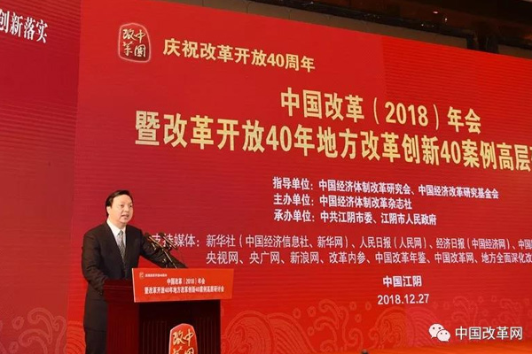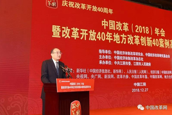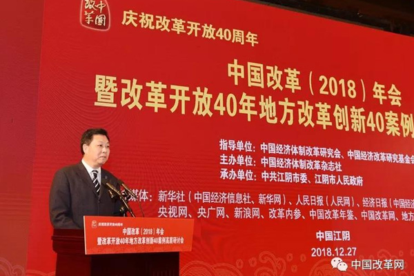 2018年12月27日,由中國(guó)經(jīng)濟(jì)體制改革研究會(huì)、中國(guó)經(jīng)濟(jì)改革研究基金會(huì)指導(dǎo),中國(guó)經(jīng)濟(jì)體制改革雜志社主辦,中共江陰市委、江陰市人民政府承辦的“慶祝改革開(kāi)放40周年——中國(guó)改革(2018)年會(huì)暨改革開(kāi)放40年地方改革創(chuàng)新40案例高層研討會(huì)”在江蘇省江陰市召開(kāi)。