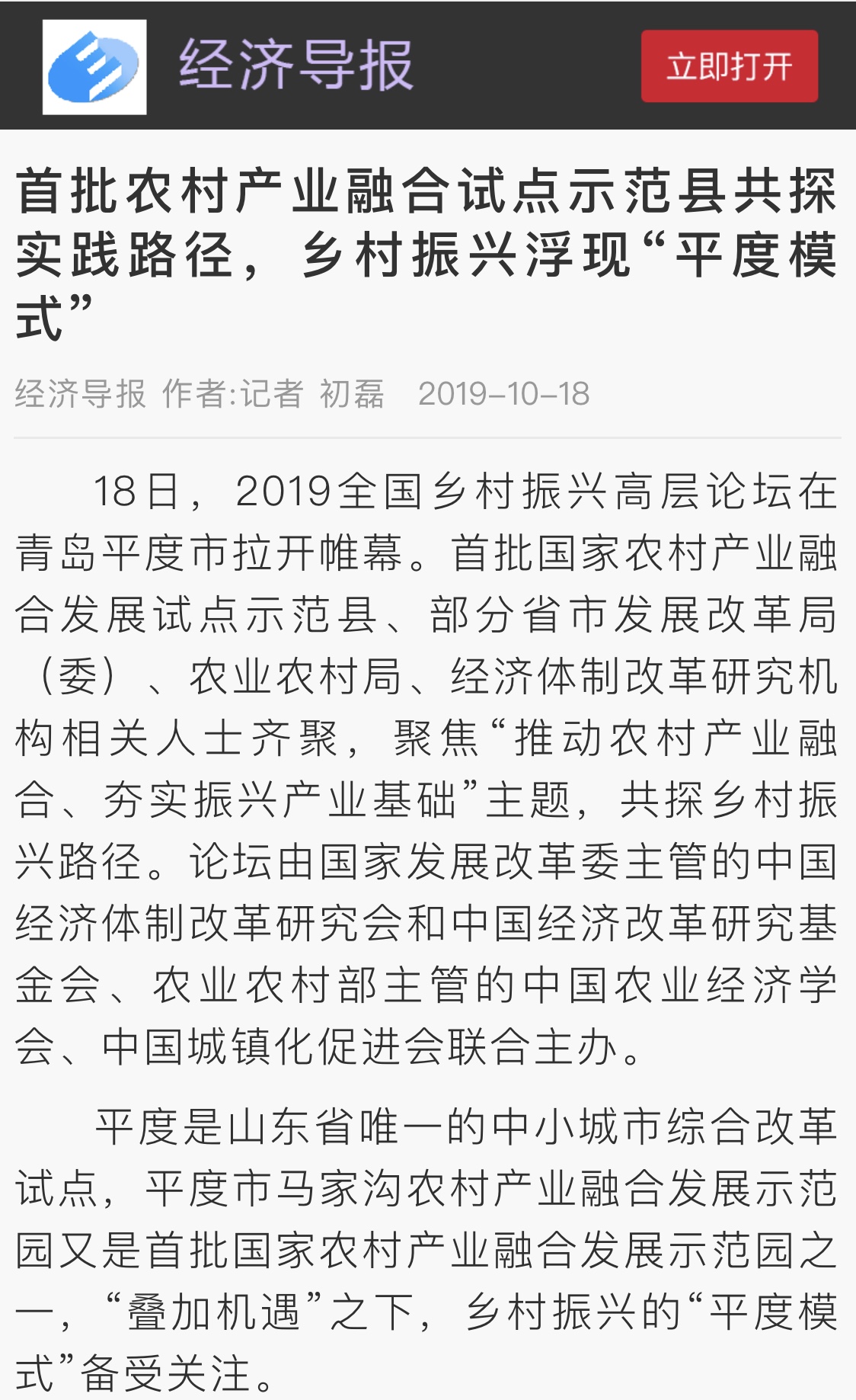 10月18日,中國(guó)經(jīng)濟(jì)體制改革研究會(huì)、中國(guó)農(nóng)業(yè)經(jīng)濟(jì)學(xué)會(huì)、中國(guó)經(jīng)濟(jì)改革研究基金會(huì)、中國(guó)城鎮(zhèn)化促進(jìn)會(huì)聯(lián)合主辦的2019全國(guó)鄉(xiāng)村振興高層論壇在平度市開(kāi)幕,開(kāi)啟了以“推動(dòng)農(nóng)村產(chǎn)業(yè)融合 夯實(shí)振興產(chǎn)業(yè)基礎(chǔ)”為主題的大討論。論壇上,中國(guó)經(jīng)濟(jì)體制改革研究會(huì)宣布把平度市列為博士后科研工作站調(diào)研基地,并授予平度“中國(guó)經(jīng)濟(jì)體制改革研究會(huì)博士后科研工作站調(diào)研基地”標(biāo)牌。
